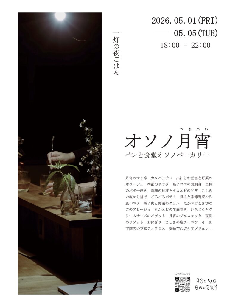 この度、ゴールデンウジーク期間中の5月1日(金)〜5月5日(火・祝)までの5日間、【期間限定】集落酒場シマバルと、オソノベーカリーの夜営業「オソノ月宵」を開催します。